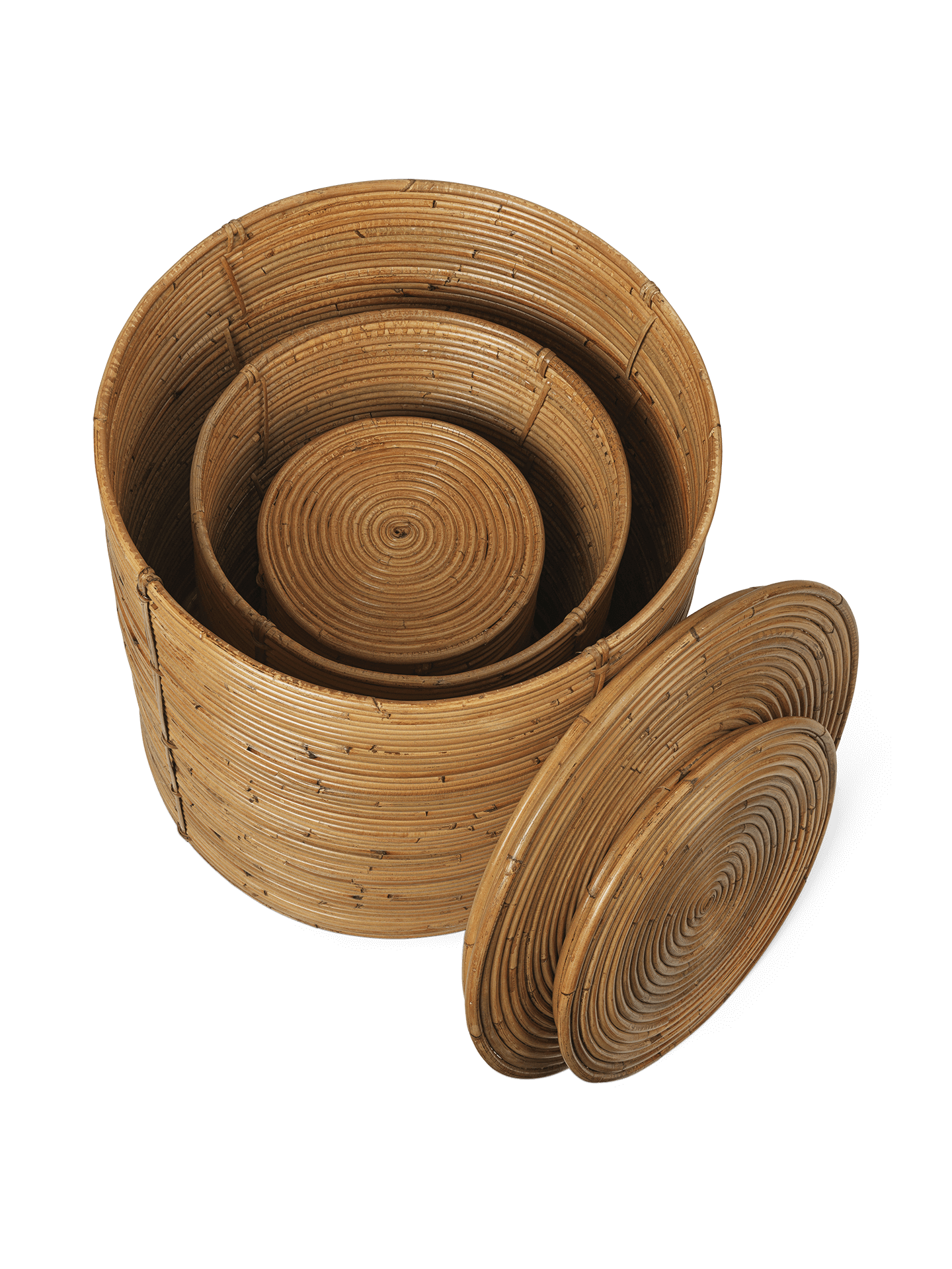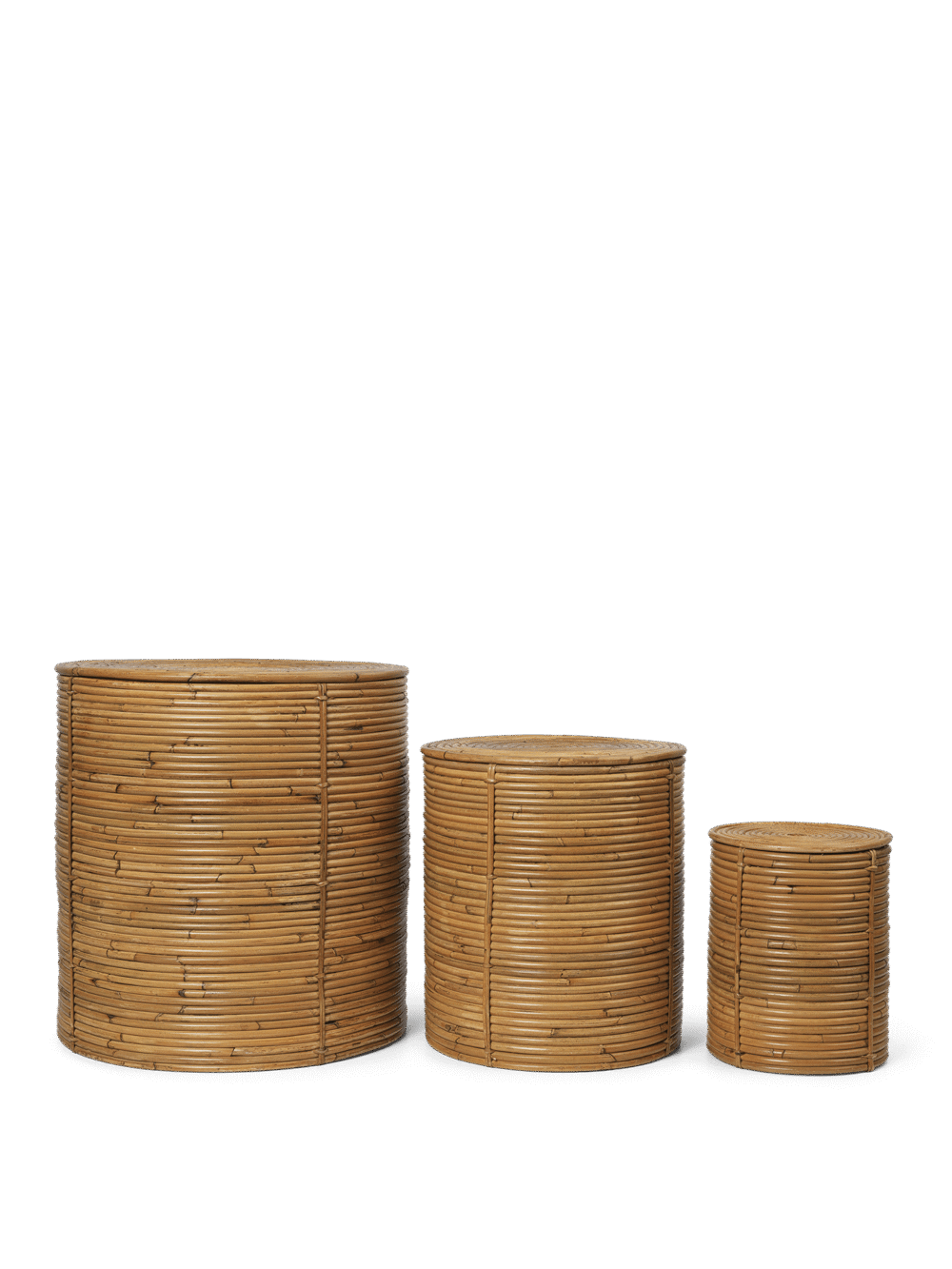 With shapes inspired by architectural columns. the Column Storage presents a versatile storage solution. The set of three baskets are made entirely from stained natural rattan. creating a beautiful contrast to their simple. clean shape. and lending each piece with a soft and organic expression. Adding to their functionality. each basket comes with a practical lid. enabling you to easily hide away any unwanted clutter. Use the Column Storage to sort your laundry. to store away your little one’s toys at the end of the day or as a decorative and useful storage solution in the living room.