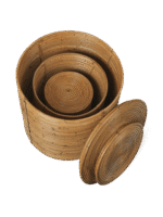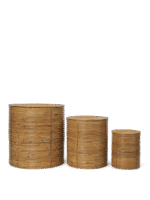 With shapes inspired by architectural columns. the Column Storage presents a versatile storage solution. The set of three baskets are made entirely from stained natural rattan. creating a beautiful contrast to their simple. clean shape. and lending each piece with a soft and organic expression. Adding to their functionality. each basket comes with a practical lid. enabling you to easily hide away any unwanted clutter. Use the Column Storage to sort your laundry. to store away your little one’s toys at the end of the day or as a decorative and useful storage solution in the living room.