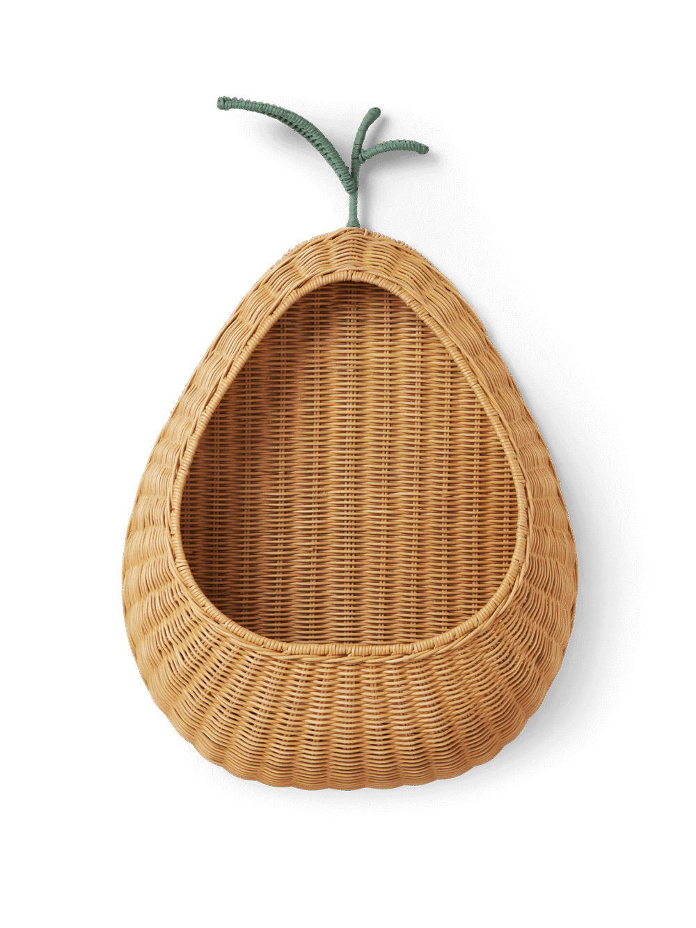 The Pear Braided Wall Pocket is an enchanting storage solution. whimsically shaped like a pear. Meticulously crafted from rattan. a warm and natural material celebrated for its durability and appealing texture. this wall pocket serves as a practical storage solution. It fosters a creative yet organised environment by neatly holding books. toys. or other small items. Adorned with a distinctive ornamental leaf braided in green rattan. it adds a decorative touch. infusing your child’s space with charm and playfulness.